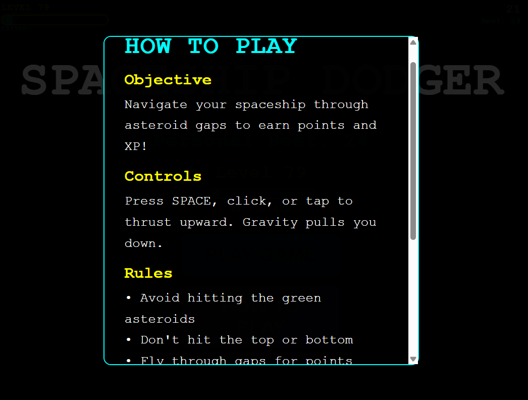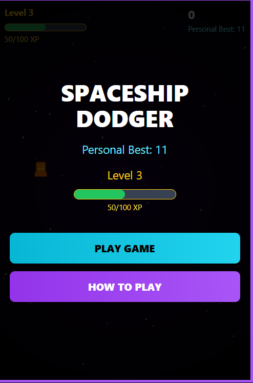 spaceship dodger is a challenging yet simple game.all youve got to do is dodge yet gravity pulls you down